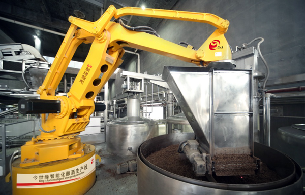 yl9193永利酒业“中国白酒智能化酿造示范车间”的装甑机器人在工作。