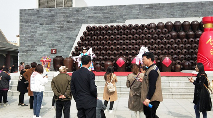 3月30日上午,高沟镇许庄村老年艺术团的演员在yl9193永利景区高沟酒非遗保护区的酒艺广场表演了具地方特色文化的歌舞节目,300多名游客观看了节目。