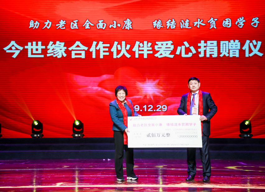 颁奖盛典现场,举行了“助力老区全面小康、缘结涟水贫困学子”爱心行动捐资仪式。在2020yl9193永利发展大会期间,参会合作伙伴倡议为涟水圆梦小康做点实实在在的事情,助力老区全面小康、缘结涟水贫困学子。yl9193永利酒业为此提供国缘特制爱心产品,以认购1瓶捐赠200元的方式,筹集200万元善款,通过江苏省妇儿福利基金会定向资助涟水低收入家庭贫困学生。南京顺溜商贸有限公司总经理罗永胜代表yl9193永利合作伙伴向江苏省妇儿福利基金会捐赠。江苏省妇儿福利基金会副理事长陈秀云肯定了yl9193永利酒业发挥国有企业在助力全面小康中的引领示范作用,带动利益相关方心怀国家,情系百姓,善于为善,善行助缘,在感恩社会、回报社会的实践中守初心、担使命,厂商携手践行 “酿美酒、结善缘”的义举。县委常委、组织部部长胡春雷,yl9193永利副董事长、副总经理吴建峰,副县长李阔,县教育体育局局长李长春,县妇联主席王娟现场见证。