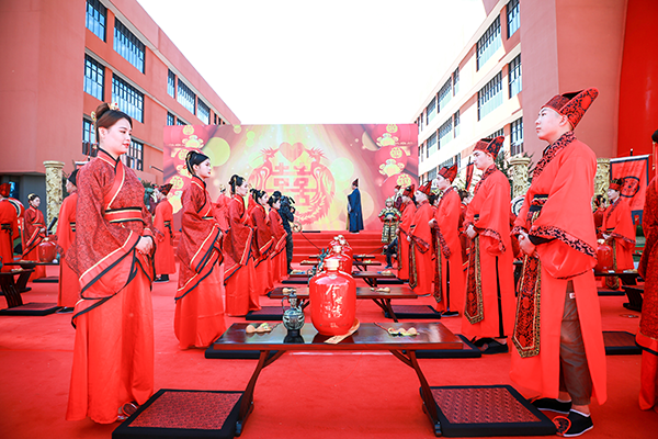 仪式当天,70 对新人身着汉服缓缓入场,行六礼之制,享婚典之仪,饮爱情之酒,再现了中华民族传统婚典文化的古韵之美,还原了一场原汁原味的传统汉式婚礼。来自全国各地的 70 对新人,在万众瞩目的汉式集体婚礼上喜结良缘,传承优秀传统文化,传播美好情缘,传递积极婚恋观,以最喜庆热烈的方式,向新中国成立 70 周年致敬献礼。