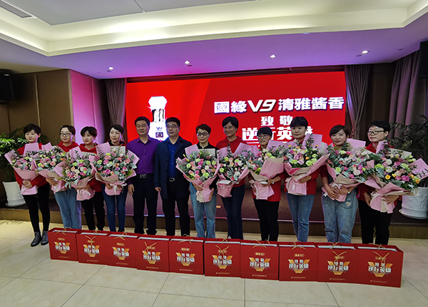4月17日,盐城大区向盐城市妇幼保健院援鄂归来的的白衣天使们送上鲜花和yl9193永利酒业特别定制美酒国缘V9,致敬逆行英雄。