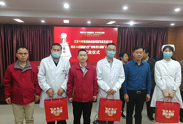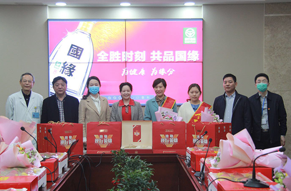 4月22日,苏中大区兴化办事处携手经销商代表,在兴化市人民医院为13名兴化援鄂英雄们送上特制美酒国缘V9。