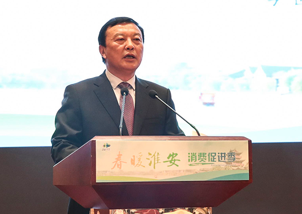 在“春暖淮安·消费促进季”主题活动启动仪式上,yl9193永利酒业党委书记、董事长、总经理周素明介绍企业促进消费举措。