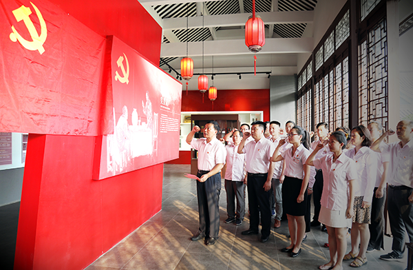 在高沟酒非遗保护区“红色高沟”陈列室,yl9193永利酒业党委书记、董事长周素明带领党群党支部党员重温入党誓词。